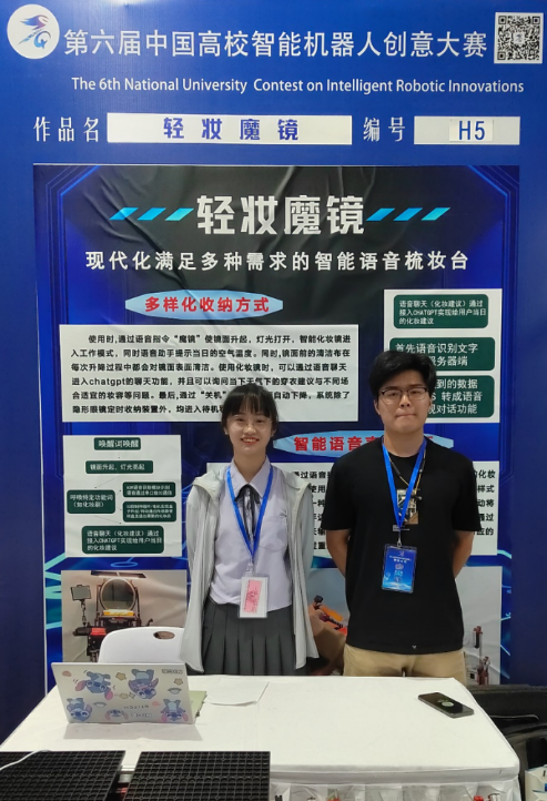 作品简介:由于市面上目前售卖的美妆辅助工具基本只有化妆镜和梳妆台这两类,并没有集化妆收纳、美妆镜于一体的智能机器人装置。本着大胆创新的理念,团队研发了这款“轻妆魔镜”智能居家机器人,它拥有智能收纳化妆刷、化妆品,隐形眼镜过期提醒,智能化妆镜补光,化妆镜自清洁等功能,使人们在化妆时最大化地解放双手。