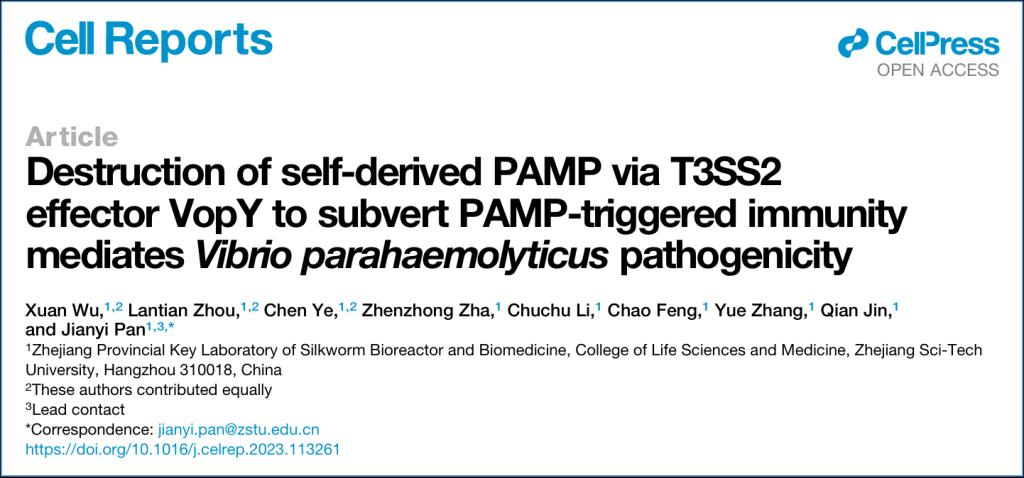 近日,生命科学与医药学院潘建义教授课题组在病原菌抗天然免疫研究领域获得新进展,揭示了海洋细菌——副溶血性弧菌通过破坏源于细菌自身的病原相关分子模式(PAMP),从而促进免疫逃逸以及肠致病性的独特机制。该项研究成果以题为“Destruction of self-derived PAMP via T3SS2 effector VopY to subvert PAMP-triggered immunity mediates Vibrio parahaemolyticus pathogenicity”的研究论文形式在Cell Reports上发表。潘建义教授为该论文的通讯作者,硕士生吴轩、周蓝天和叶晨为共同第一作者,mk官方网站_mk(中国)为唯一完成单位,该研究得到了国家自然科学基金面上项目和浙江省自然科学基金等项目资助。
