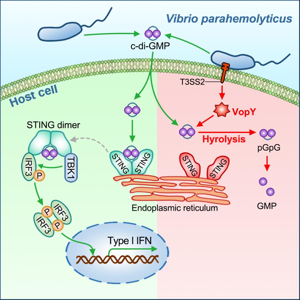 副溶血性弧菌是嗜盐性革兰氏阴性菌,广泛分布于世界各地的海洋、河口、沿海环境中,是鱼、虾、蟹、贝类等的重要病原菌,同时也是一种常见的食源性病原菌,是全球范围内引起肠胃炎的主要病原菌。临床分离的致病性菌株编码两套T3SS(T3SS1和T3SS2),其中T3SS2只存在于致病性菌株。潘建义教授课题组在副溶血性弧菌基因组的VpaI-7致病岛上鉴定了一个新基因,命名为vopY,其编码的蛋白质VopY被鉴定为磷酸二酯酶,可特异性水解c-di-GMP。同时,VopY还被鉴定为T3SS2效应蛋白,可在细菌感染时被T3SS2注入宿主细胞。随后的研究证实,宿主细胞中的VopY通过水解c-di-GMP以阻断由c-di-GMP激活的STING-TBK1-IRF3信号通路,成功抑制宿主的免疫应答。进一步研究显示VopY不仅促进副溶血性弧菌引起强烈的肠毒性,也会导致一定程度的细胞毒性,表明VopY独特的抑制免疫机制是副溶血性弧菌重要的肠致病性机制。