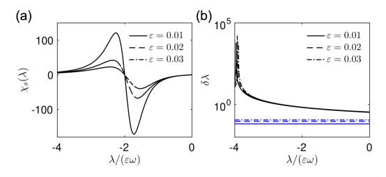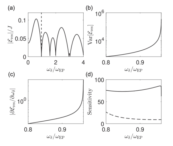 图2.在离子阱平台实现的非厄米量子系统中,由于信号和噪声都存在着发散,标准定义的灵敏度在例外点处并不会发散,并且不会超越相应厄米传感器的灵敏度极限(虚线)。