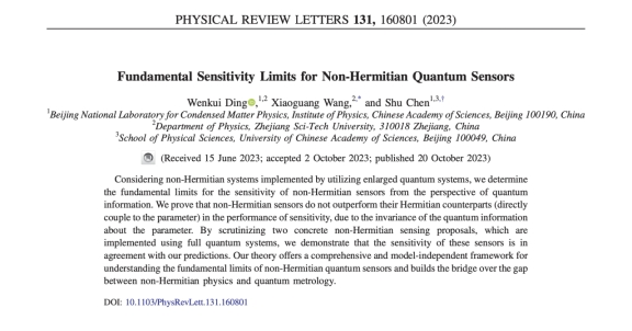 近日,我校理学院青年教师丁文魁博士在国际物理学顶级期刊Physical Review Letters发表了题为“Fundamental Sensitivity Limits for Non-Hermitian Quantum Sensors”的研究论文,我校理学院王晓光教授与中国科学院物理研究所陈澍研究员为共同通讯作者。该工作受到科技部国家重点研发计划(2021YFA1402104) 、国家自然科学基金委 (No. 12174436, No.11935032,No. T2121001) 和中国科学院先导专项(No. XDB33000000) 等项目的资助。