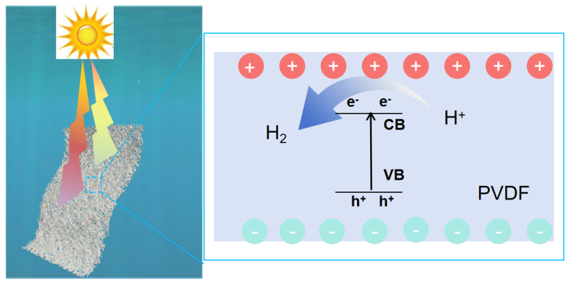 在此基础上,团队针对光生载流子传输困难的问题,受海草随水流摇摆的启发,通过静电纺丝技术,以压电材料聚偏二氟乙烯(PVDF)和聚环氧乙烷(PEO)为基材,负载g-C3N4/Pt纳米片,制备静电纺丝复合膜。与常规的将g-C3N4/Pt纳米片沉积于PVDF薄膜表面的策略相比,嵌入PVDF纤维内部的C3N4/Pt可与PVDF形成氢键作用,提升PVDF的b相含量和压电性能。在水流驱动下,PVDF由于形变产生的压电效应,可延缓光生载流子的复合,提高g-C3N4/Pt的光催化性能。