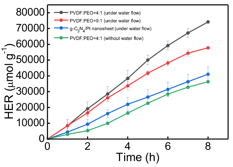 与传统g-C3N4/Pt-纳米片(5220μmol h-1g-1)相比,当PVDF与PEO质量比为4:1时,g-C3N4/Pt-PVDF多孔静电纺丝复合膜的光解水产氢速率达到9278μmol h-1g-1,产氢速率提升近一倍。因此,本研究制备获得的g-C3N4/Pt-PVDF多孔静电纺丝复合膜可在天然水环境(例如海洋或湖泊)中,借助水流的自然能量提升光解水产氢效率。