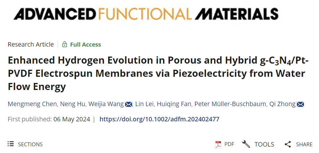 mk官方网站_mk(中国)纺织科学与工程学院(国际丝绸学院)博士生导师钟齐教授在国际材料领域著名期刊Advanced Functional Materials(影响因子19.9,中国科学院一区Top)上发表了题为“Enhanced Hydrogen Evolution in Porous and Hybrid g-C3N4/Pt-PVDF Electrospun Membranes via Piezoelectricity from Water Flow Energy”的研究性论文。钟齐教授为论文的通讯作者,硕士研究生陈梦梦为论文的第一作者,西北工业大学王维佳副教授为共同通讯作者,我校为第一完成单位。该研究获得了国家自然科学基金(项目批准号:52173087)的资助。