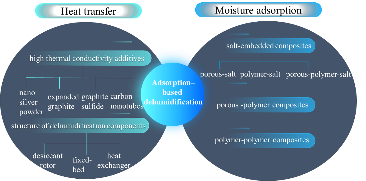 单一的干燥剂材料例如多孔物理干燥剂、吸湿性盐以及吸湿性聚合物,存在着或吸湿能力低或再生温度高或潜在腐蚀等问题。而复合干燥剂的出现能够很好地改善单一干燥剂存在的问题,对此,我院郑旭团队针对近年来基于吸附除湿的复合干燥剂材料进行全面综述,从传热与传质两个角度出发,介绍了如何提升传热性能和如何改善吸湿性能的途径。
