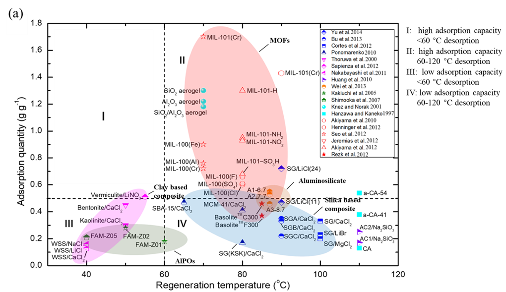 干燥剂的吸附和再生性能:2015年前(X. Zheng, T.S. Ge, R.Z. Wang. Recent progress on desiccant materials for solid desiccant cooling systems[J]. Energy, 2014. 74: 280-294.)