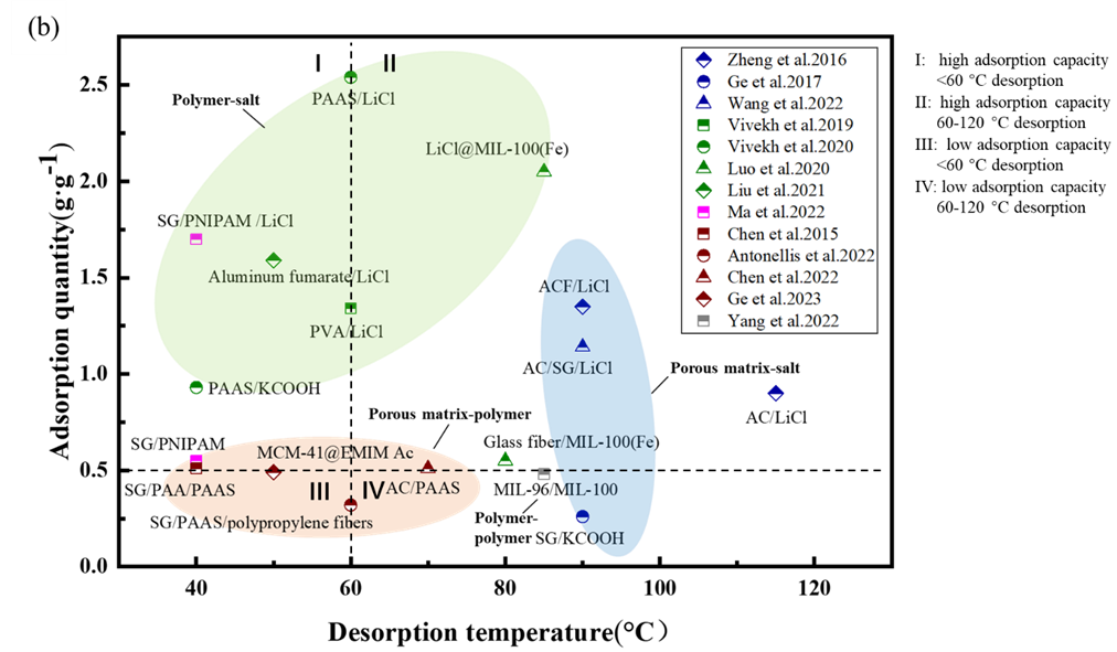 干燥剂的平衡吸附量和解吸能力和吸附-解吸动力学对系统的除湿性能有很大影响。该文对2015年之后的复合干燥剂的吸湿能力和再生温度进行归纳总结,并绘制成图。和2015年之前的干燥剂相比,目前,出现了不少落于区域I,即在低再生温度下(如40~60 °C)同时具有较高吸附量(>0.5 g·g-1)的复合干燥剂。特别是基于热响应聚合物PNIPAM的复合干燥剂,可以实现40°C的快速再生。