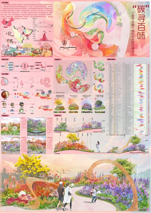 方案以成都“因锦而兴”为文脉起源,以城市建设中锦江的发展变化为切入点,落脚于节能减排、绿色低碳景观的建设,绘出令人神往的锦城新景。设计概念围绕“锦”这一主题,从“锦江”“蜀锦”“锦葵科花卉”中分别提取设计元素。设计整体分为三个阶段:锦江古韵、蜀锦芙蓉、锦城展望,分别对应过去、现在和未来,将锦江水系线条和蜀锦芙蓉花纹融入平面结构的形成,提取成都特色元素搭建构筑物。在植物选择上,以锦葵科植物为主题贯穿花境各部分,通过多年生植物的搭配,色调由清新淡雅的白绿过渡为热烈奔放的红黄,最后转为未来科幻的蓝紫,植物质感与铺装也由开始的粗犷自然过渡到精致立体,打造出层次丰富、色彩丰富的长效低维护景观。
