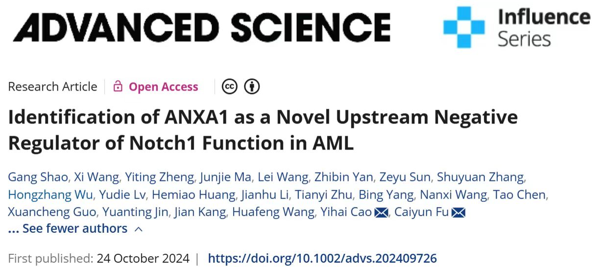 10月24日,我校生命科学与医药学院付彩云教授团队在国际知名期刊Advanced Science(中科院1区TOP,影响因子14.3)在线发表了题为“Identification of ANXA1 as a Novel Upstream Negative Regulator of Notch1 Function in AML”的研究论文。付彩云教授为本论文的最后通讯作者(lead contact),付彩云教授指导的博士研究生邵罡、中国人民解放军联勤保障部队第九〇三医院王喜主任、付彩云教授指导的硕士研究生郑伊婷和马俊杰为本文共同第一作者,该论文被选为将于12月正式出版的第11卷第48期的封面文章。