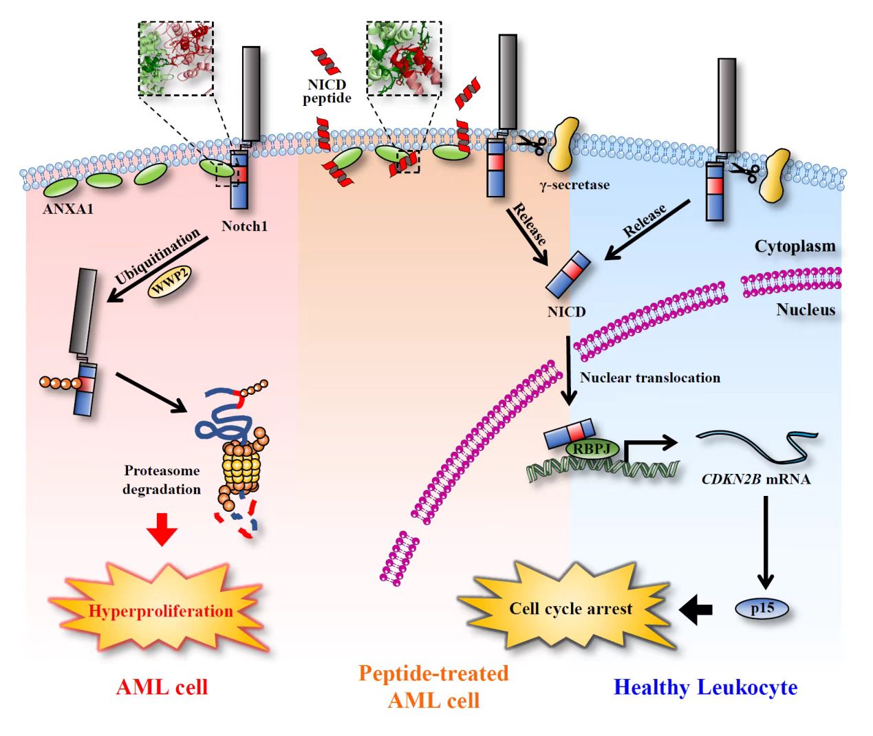 图1:ANXA1-Notch1-p15信号轴调控人AML细胞过度增殖以及NICD肽治疗AML的机制示意图。