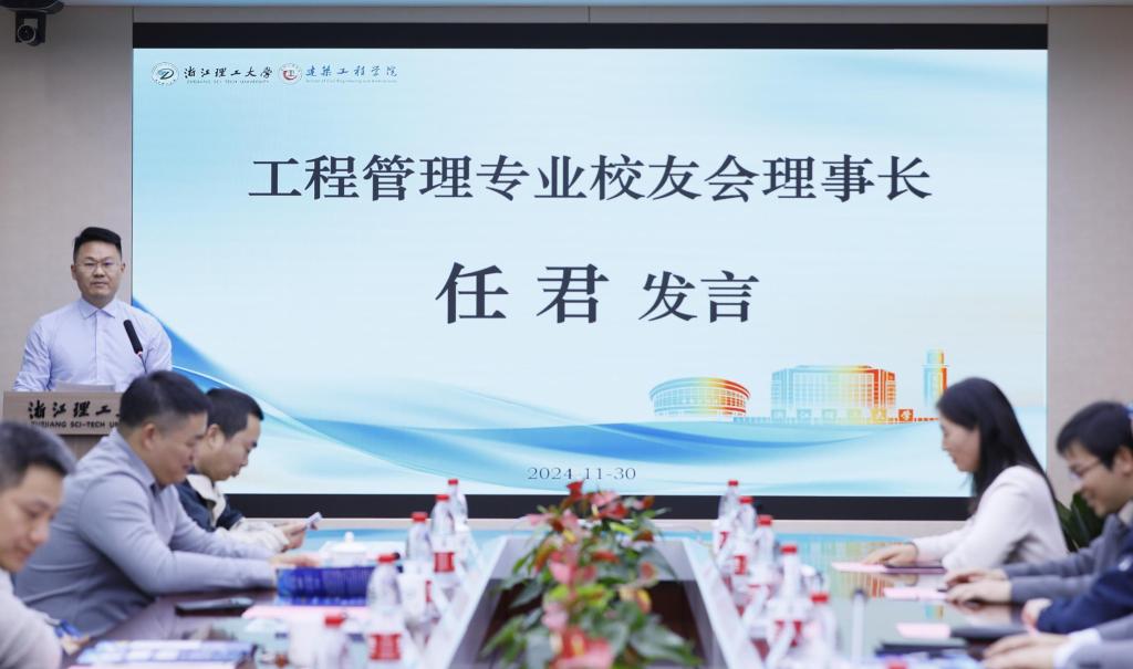 学院工程管理专业2010届校友、工程管理专业校友会会长任君向所有为筹建工程管理专业校友会的老师和校友表示感谢。他与大家分享了几点思考与实践:一是搭建平台,促进校友间交流合作。二是回馈母校,助力人才培养与科研创新。三是传承精神,弘扬建工文化。