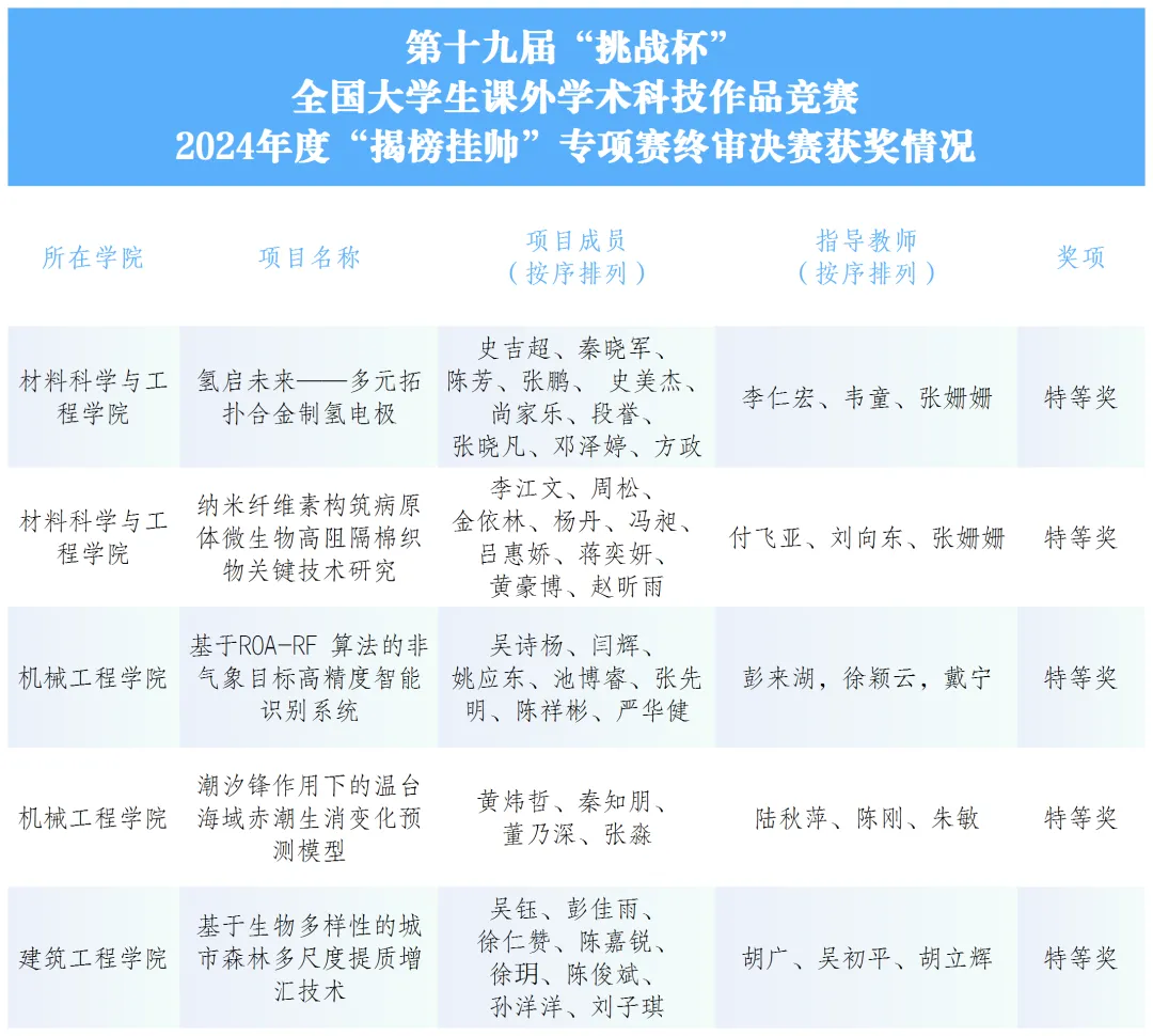学校高度重视该项赛事。自2024年4月“挑战杯”揭榜挂帅专项赛发榜以来,校党委副书记缪鲁加全程指导比赛进程,在北京、浙江比赛现场关心鼓励参赛师生。在学校党委和团省委的指导下,校团委提前谋划、精密组织,为优质项目提供全方位精准化指导与服务。各参赛学院、指导教师聚焦“卡脖子”技术,瞄准社会重大课题及现实问题,密切配合、凝聚合力,组织引导学生团队踊跃投身科研攻关第一线,促进科技创新成果向现实生产力转化。赛后,校长陈文兴第一时间向获奖队伍表达了祝贺。