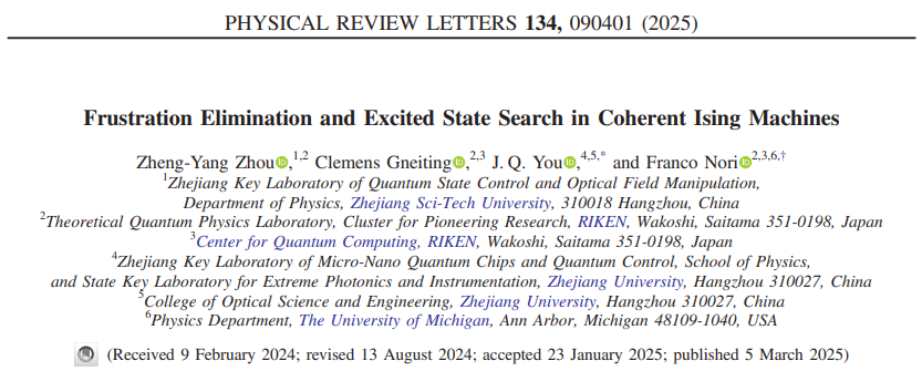 近日,我校理学院青年教师周正阳博士在国际知名物理期刊Physical Review Letters上发表了题为“Frustration Elimination and Excited State Search in Coherent Ising Machines”的研究论文。周正阳博士为论文的第一作者,浙江大学的游建强教授和日本理化学研究所的Franco Nori教授为共同通讯作者,mk官方网站_mk(中国)为论文的第一署名单位。该工作依托于浙江省全省量子物态与光场调控重点实验室完成,并得到了浙江省全省微纳量子芯片与量子调控重点实验室以及极端光学技术与仪器全国重点实验室的技术支持。同时,该工作得到了国家自然科学基金以及mk官方网站_mk(中国)科研启动基金的经费支持。