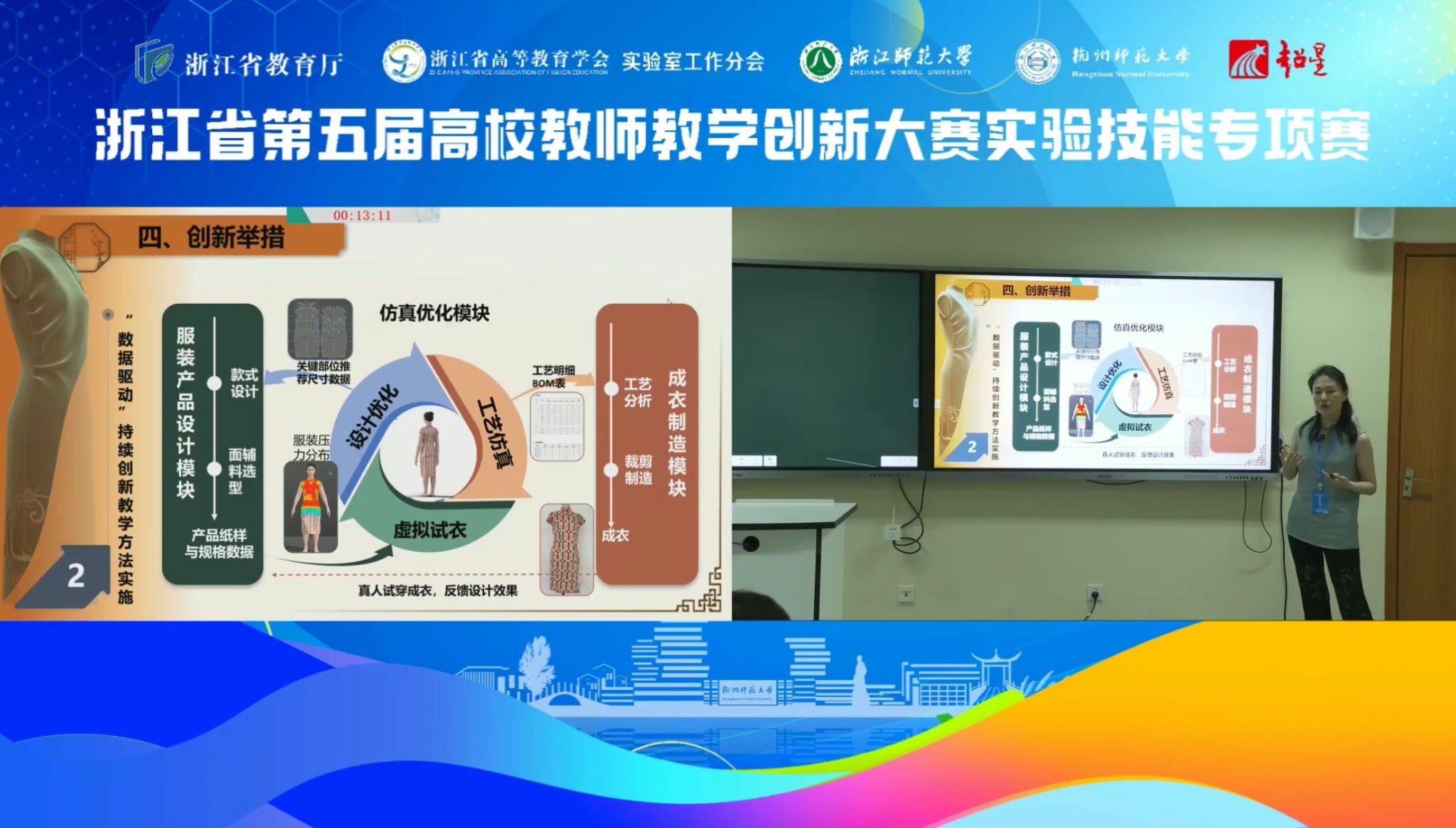 沈海娜教师团队的参赛作品《“虚实融合·数据驱动”综合实践类课程(项目实习)的实验教学创新——以旗袍个性化定制为例》,构建了“虚实双线-数据贯通”的实验教学体系。该作品将数字化技术深度融入服装设计工程专业实践,通过“设计→仿真→生产”三级模块化实验设计,结合节点化任务、数据驱动和持续改进的教学安排,依托虚实联动的教学平台及校企协同实践基地,着力培养具备数据思维、技术融合能力、协同创新精神和思辨能力的服装设计专业人才,为服装专业实践教学改革提供了新思路和借鉴。