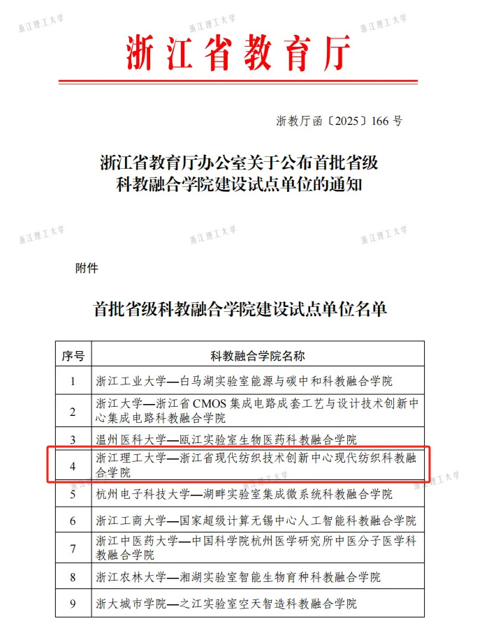 7月4日,浙江省教育厅办公室公布了首批省级科教融合学院建设试点单位名单,mk官方网站_mk(中国)-浙江省现代纺织技术创新中心现代纺织科教融合学院成功入选。