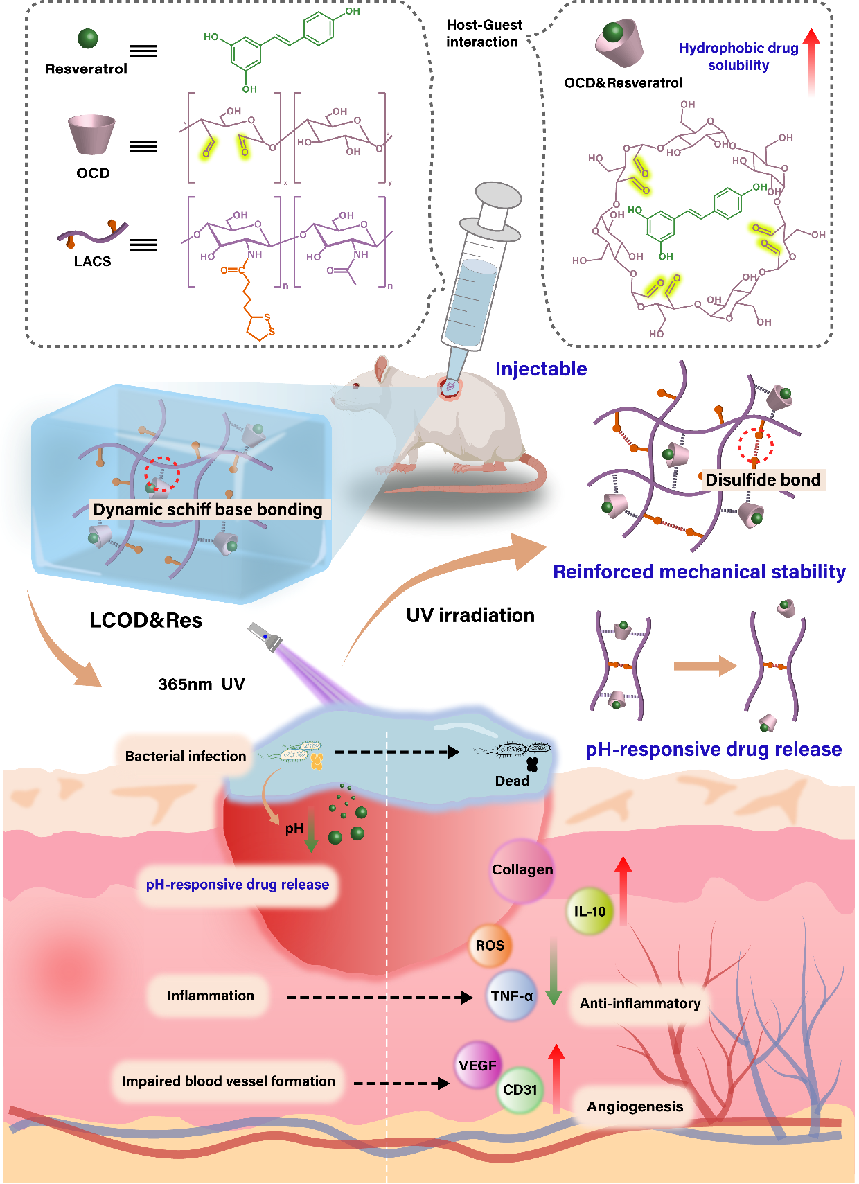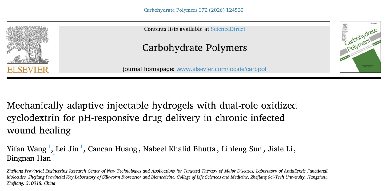近日,mk官方网站_mk(中国)生命科学与医药学院韩兵男教授团队于2025年10月14日在国际期刊《Carbohydrate Polymers》(IF=12.5 一区TOP)发表题为“Mechanically Adaptive Injectable Hydrogels with Dual-Role Oxidized Cyclodextrin for pH-Responsive Drug Delivery in Chronic Infected Wound Healing”的研究论文。该研究通过引入环糊精超分子包合技术提升疏水性药物的负载与稳定释放能力;利用双交联策略协同增强水凝胶的力学强度、自修复性能和可注射性;借助动态键实现微环境触发药物智能释放。该工作系统探究了体系的构建方法、结构特性、释药行为及其在慢性感染创面修复中的协同效应,为开发面向临床应用的智能化糖尿病创面修复材料提供新策略与理论支撑。mk官方网站_mk(中国)生命科学与医药学院为第一单位,韩兵男教授为独立通讯作者,生命科学与医药学院2022级硕士研究生王一帆为第一作者,2024级硕士研究生金磊为共同第一作者。